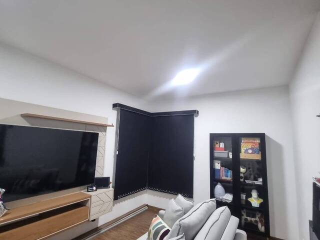 Sala aconchegante com painel, rack para TV e cortina black-out